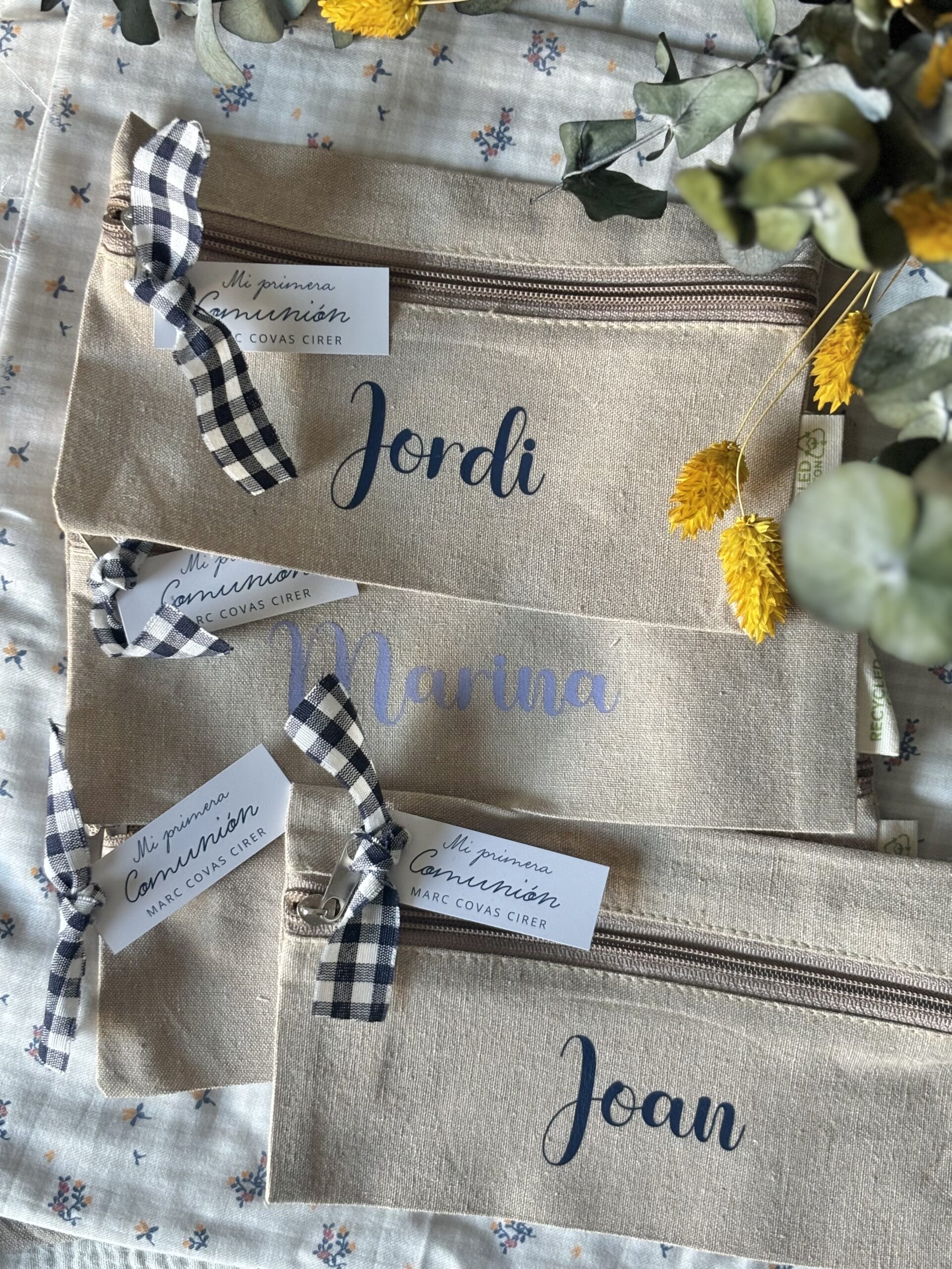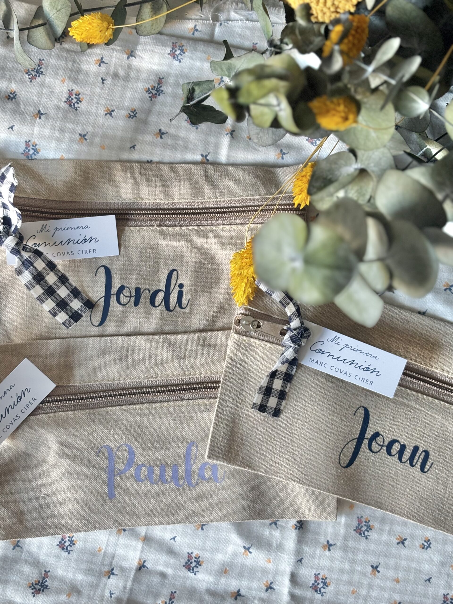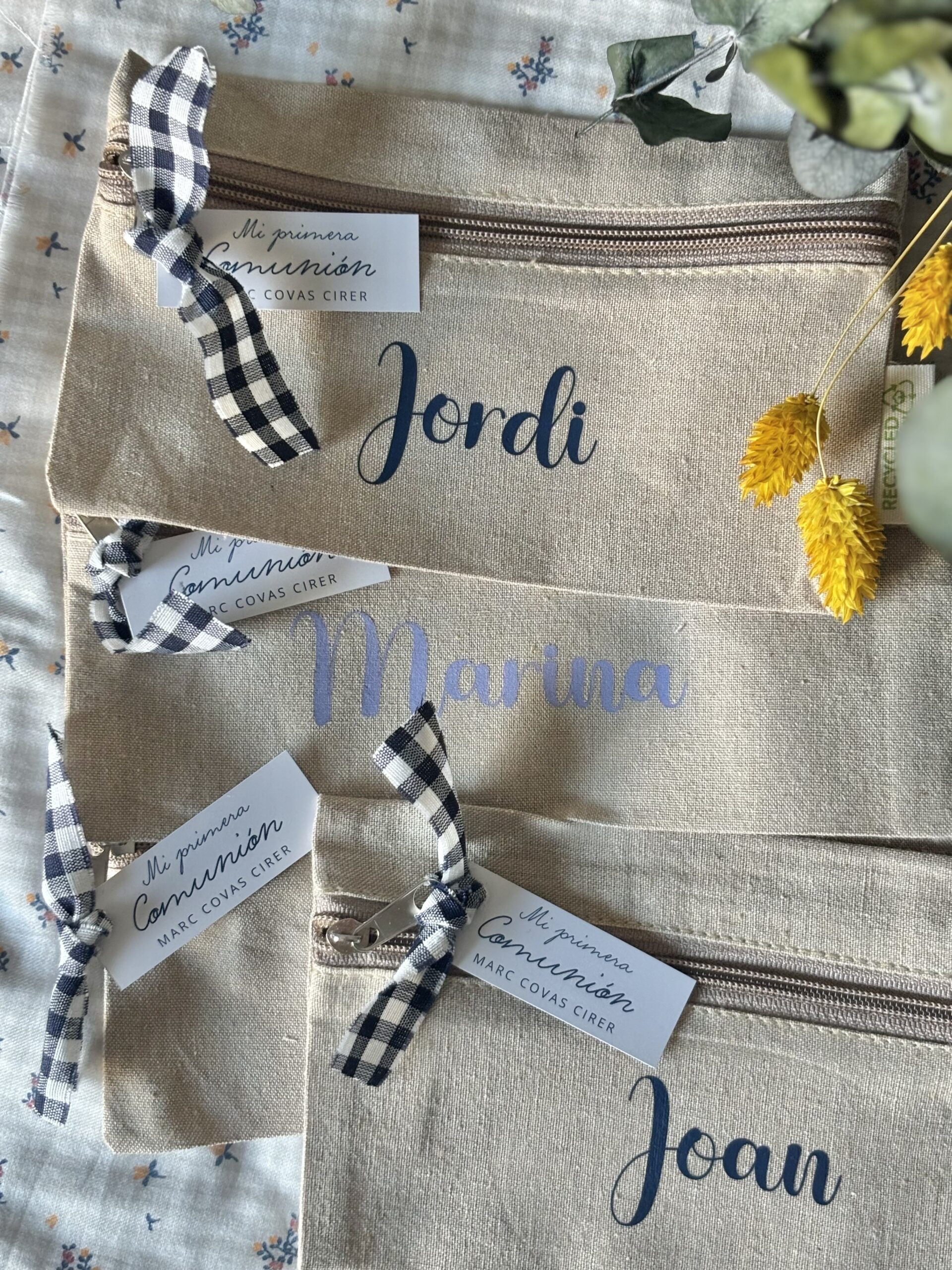 Personaliza tus estuches con una etiqueta personalizada. En ella podrás añadir el nombre o nombres de los protagonitas del evento, la fecha o el tipo de celebración, ¡tú eliges!. Nos pondremos en contacto contigo tras tu compra para ir trabajando en todo ello. Te pediremos que nos facilites todos los nombres que irán en los estuches, el color elegido para todos ellos y te enviaremos el catálogo de tipografías para que elijas la que más se adapte a tu estilo.