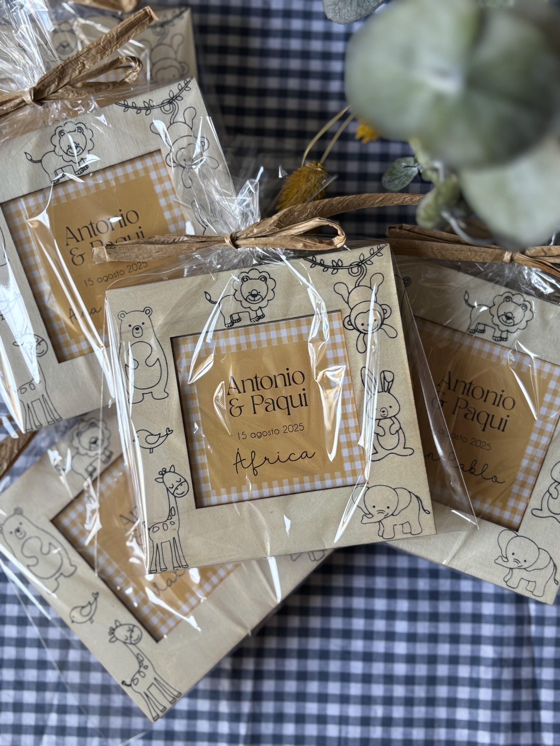 Celebra tu día especial regalando a tus invitados nuestro portafotos infantil para colorear, ideales para los invitados más pequeños al evento. Hecho de madera natural con diseño de animales y ceras de colores que permiten personalizar el diseño de cada portafotos. Diseñado para fotografías de 7,5 x 7,5 cm. Cuenta con soporte trasero de bisagra.