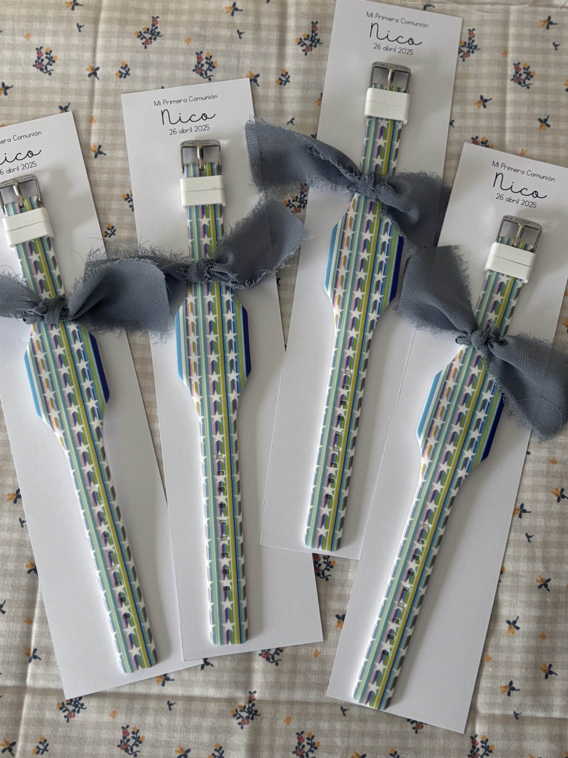 Personaliza tus relojes con una etiqueta personalizada y lazo. Nos pondremos en contacto contigo tras tu compra para ver todas las opciones disponibles de diseño. Será entonces cuando necesitaremos todos los datos que quieras que aparezca en la etiqueta. Nosotras nos ocupamos de todo, no te preocupes.
